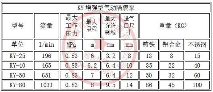 2)、增強型不銹鋼氣動隔膜泵整體構造上更加優化,泵腔和主管路都有明顯加強,自吸功能和流量揚程都有很大改善;KY型氣動隔膜泵最大流量可以達到62立方米/小時,最大壓力可以達到8公斤。