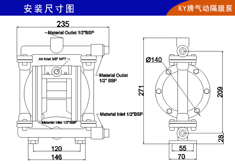 11、KY增強型氣動隔膜泵可做多種材質泵體,具有良好的抗腐蝕性,適用于各種介質