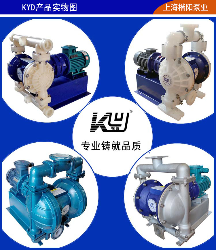 KYD型電動隔膜泵是一種采用BLY擺線針輪減速機傳動動力的往復(fù)泵,上海楷陽電動隔膜泵廠家經(jīng)過數(shù)十年的研發(fā)改進,生產(chǎn)出了具有國際水平的電動隔膜泵。其材質(zhì)也取得了突破性的進展,上海楷陽電動隔膜泵廠家生產(chǎn)的KYD型電動隔膜泵主要材質(zhì)有304不銹鋼隔膜泵、316L不銹鋼隔膜泵、電動鑄鐵隔膜泵、電動鋁合金隔膜泵、工程塑料(增強聚丙烯)電動隔膜泵、氟塑料(聚偏氟乙烯)電動隔膜泵和耐腐蝕抗壓性能超強的鋼襯氟電動隔膜泵等。