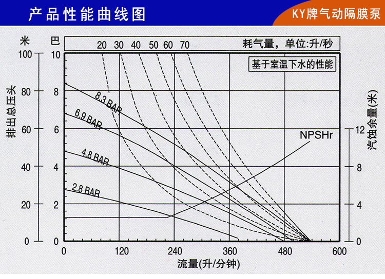 6)、KY50LF氣動隔膜泵整體構造上更加優化,泵腔和主管路都有明顯加強,自吸功能和流量揚程都有很大改善,并且可通過氣閥開度實現無級調節