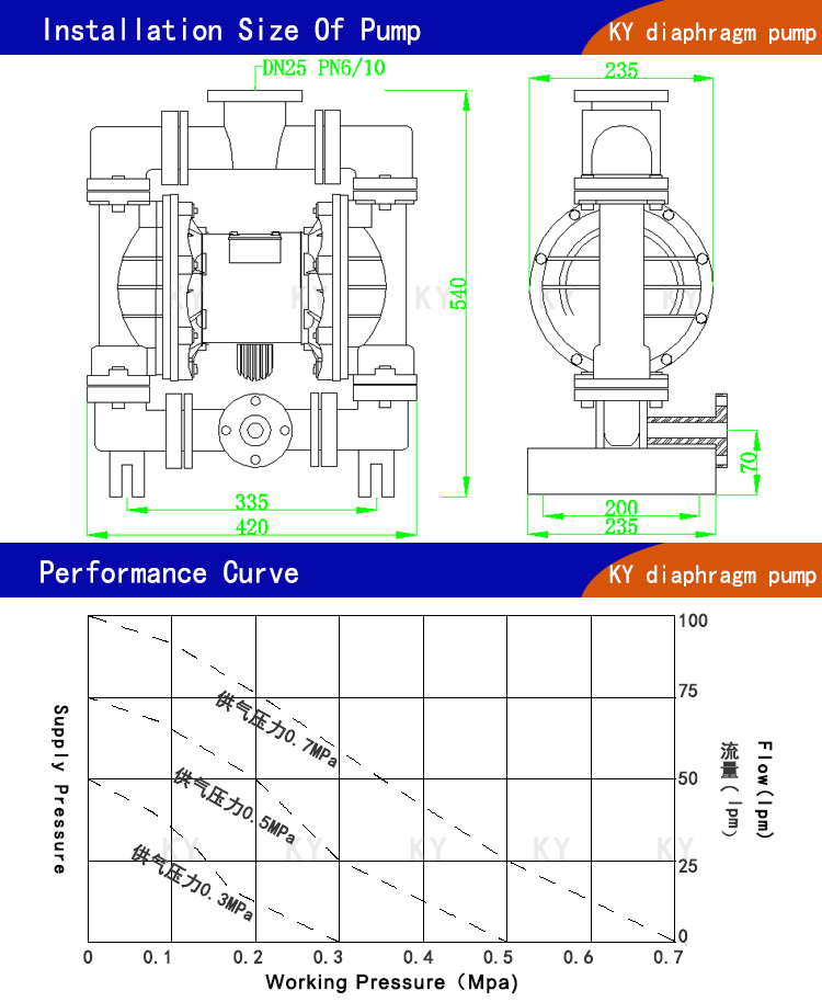 2)QBY-K25LC氣動隔膜泵進出口管道采用三節連接,中間進出口管道可以360度旋轉,方便使用安裝。