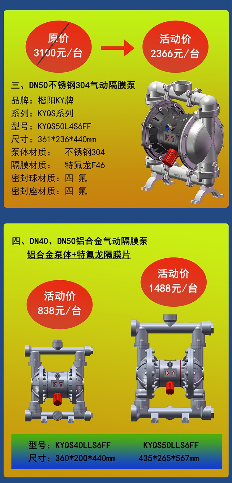 本期活動為楷陽氣動隔膜泵四大系列中的KYQS輕巧靈便系列產(chǎn)品,九大材質(zhì)中的不銹鋼304和鋁合金材質(zhì)產(chǎn)品,詳情請仔細閱讀以下細則:
