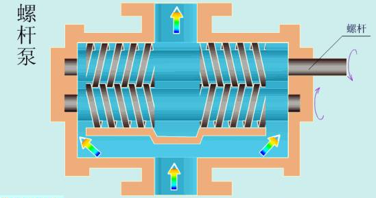 雙螺桿泵與齒輪泵十分相似,一個(gè)螺桿轉(zhuǎn)動,帶動另一個(gè)螺桿,液體被攔截在嚙合室內(nèi),沿桿軸方向推進(jìn),然后被擠向中央排出。