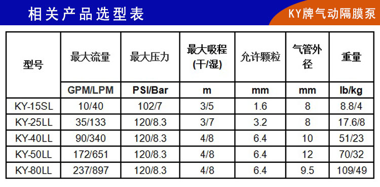 9、KY牌鋁合金氣動(dòng)隔膜泵整體構(gòu)造上更加優(yōu)化,泵腔和主管路都有明顯加強(qiáng),自吸功能和流量揚(yáng)程都有很大改善。