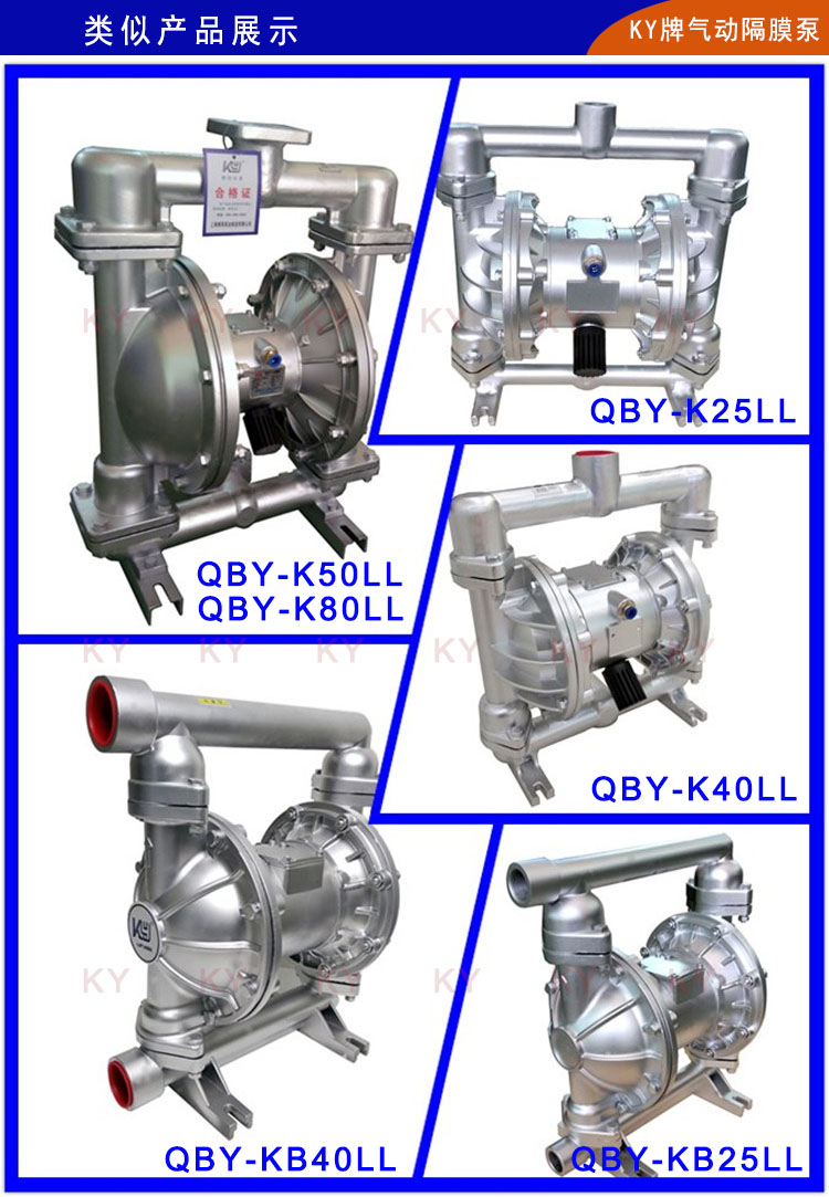 QBY-K25LL鋁合金氣動隔膜泵是第四代氣動隔膜泵,它以壓縮空氣為動力;左右兩個泵腔分別裝有彈性隔膜,因此又稱氣動雙隔膜泵。當壓縮氣體進入中間馬達體,馬達體會將壓縮氣體壓入隔膜泵其中一腔從而推動隔膜片運動擠壓液體流出,同時隔膜泵的另一腔因為被拉出而吸入液體。當隔膜片到達終點,配氣閥機構自動將壓縮空氣引入泵腔另一端,推動隔膜片朝相反方向運動,從而使雙隔膜片在泵體的兩個腔做往復運動,抽動液體流動。上海楷陽為方便客戶使用,第四代QBY-K25氣動隔膜泵已經研發了十余種材質生產:鑄鐵氣動雙隔膜泵、鋁合金氣動隔膜泵、不銹鋼304氣動雙隔膜泵、不銹鋼316L氣動雙隔膜泵、工程塑料(增強聚丙烯)氣動隔膜泵、氟塑料(PVDF)氣動隔膜泵和耐腐蝕抗壓性能超強的鋼襯氟氣動雙隔膜泵等。
