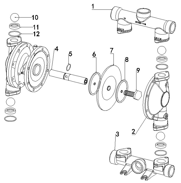 第一種氣動隔膜泵漏氣現(xiàn)象是由于馬達(dá)端的氣源進(jìn)入液體端造成的;屬于容積泵,馬達(dá)端通過馬達(dá)體進(jìn)氣并左右換氣,通過左右隔膜片推動液體端使其容積大小變化,而產(chǎn)生流體。馬達(dá)端和液體端靠隔膜片和隔膜壓板隔離開來,漏氣說明隔膜片破裂或者壓板松動造成。此時需要檢查隔膜片和內(nèi)外壓板,由于隔膜片是易損件,不在質(zhì)保范圍內(nèi)(除楷陽KY261系列產(chǎn)品);所以楷陽泵業(yè)建議用戶購買隔膜泵時請加購隔膜片、密封球和密封座,用以備用。檢查隔膜片和內(nèi)外壓板請參考下圖: